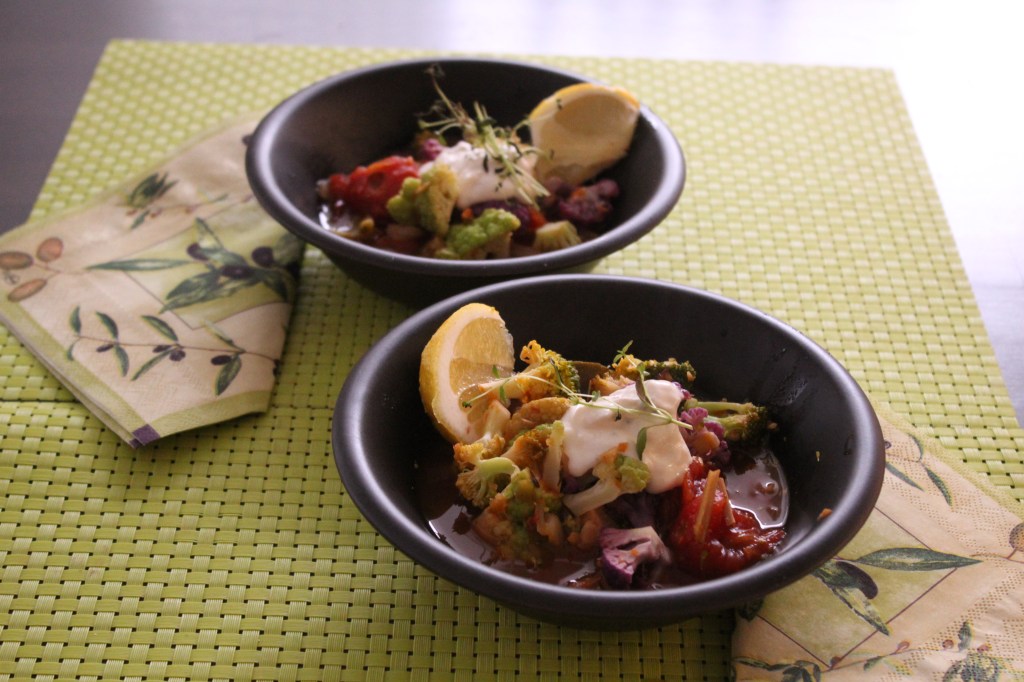 Keittelin kaalikeiton. En perinteistä, vaan tulisen version. Käytin siihen valko-, parsa- ja kukkakaalia, purjoa, porkkanaa ja säilyketomaatteja. Maustoin chilillä, raastetulla inkiväärillä, valkosipulilla ja timjamilla. Koristelin tilkalla kermaviiliä. Tätä meillä syödään seuraavat pari päivää.