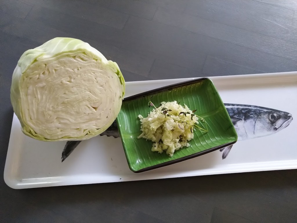 Kokeilin marinoida keräkaalia. Hienonsin kaalin yleiskoneella, mutta siitä tuli vähän liiankin hienoa. Juustohöylä taitaisi sopia paremmin karhean raasteen tekoon. Sekoitin marinadiin valkoviinietikkaa, saman verran ruokosokeria, puristettua luomusitruunaa, sormisuolaa, sitruunapippuria ja tuoretta timjamia. Kaadoin sen kaalisilpun sekaan ja annoin vetäytyä pari tuntia. Maku oli sitruunaisen raikas.