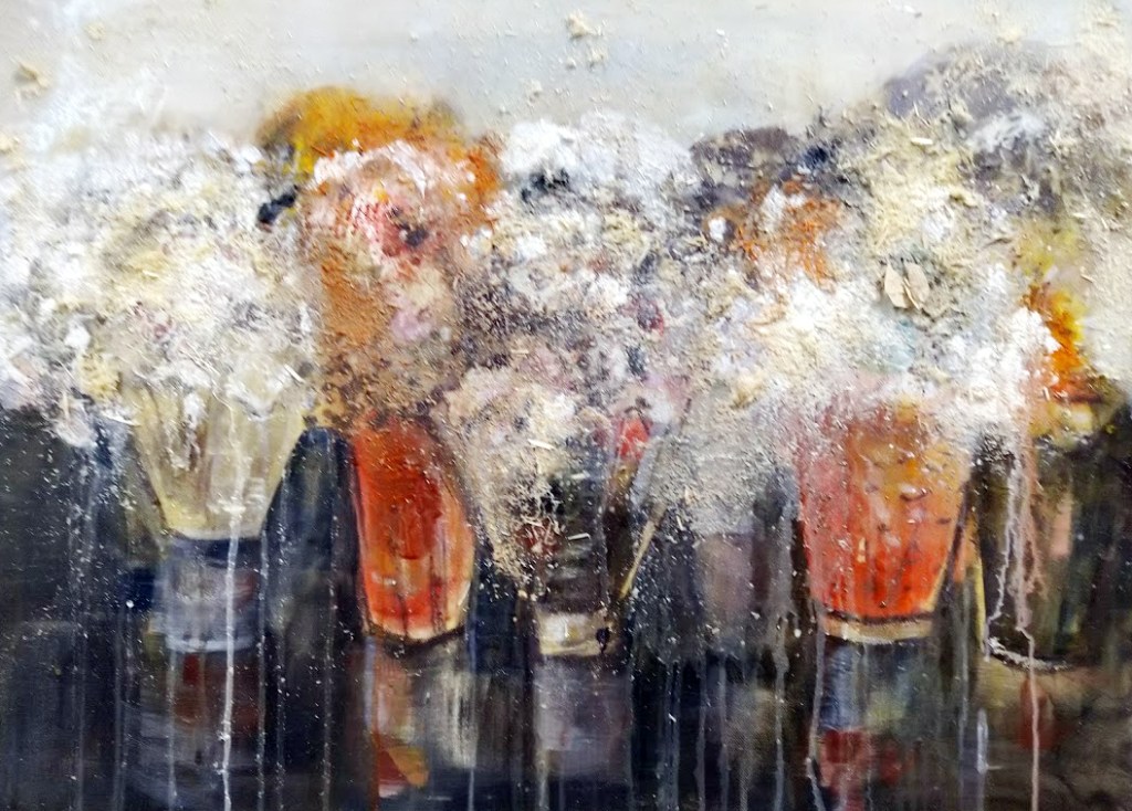 Yllä olevia kukkamaljoja olen maalannut moneen kertaan. Onko se nyt valmis, en tiedä.