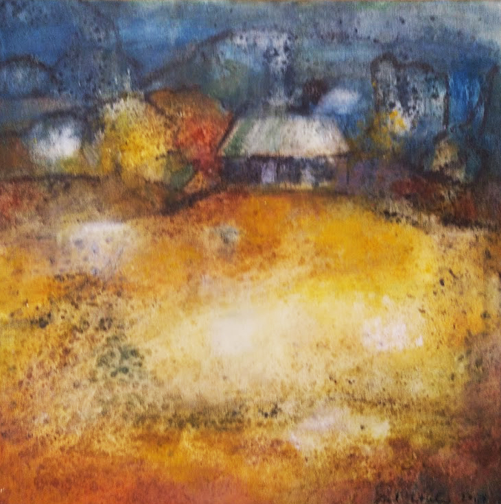 Tämä syksyinen maisema sai myös uutta ilmettä. Olen maalannut kukat ja maiseman temperaväreillä. Niiden maanläheinen hehku viehättää silmää.