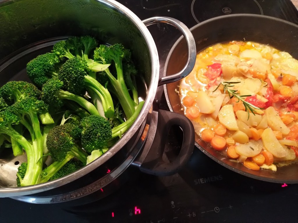 Laitoin lampaan kaveriksi kasvispaistoksen. Pataan pääsi perunoita, porkkanoita, sipulia, valkosipulia, inkivääriä ja tuoretta rosmariinia. Höyrytin lisäksi vielä broccolinoja.