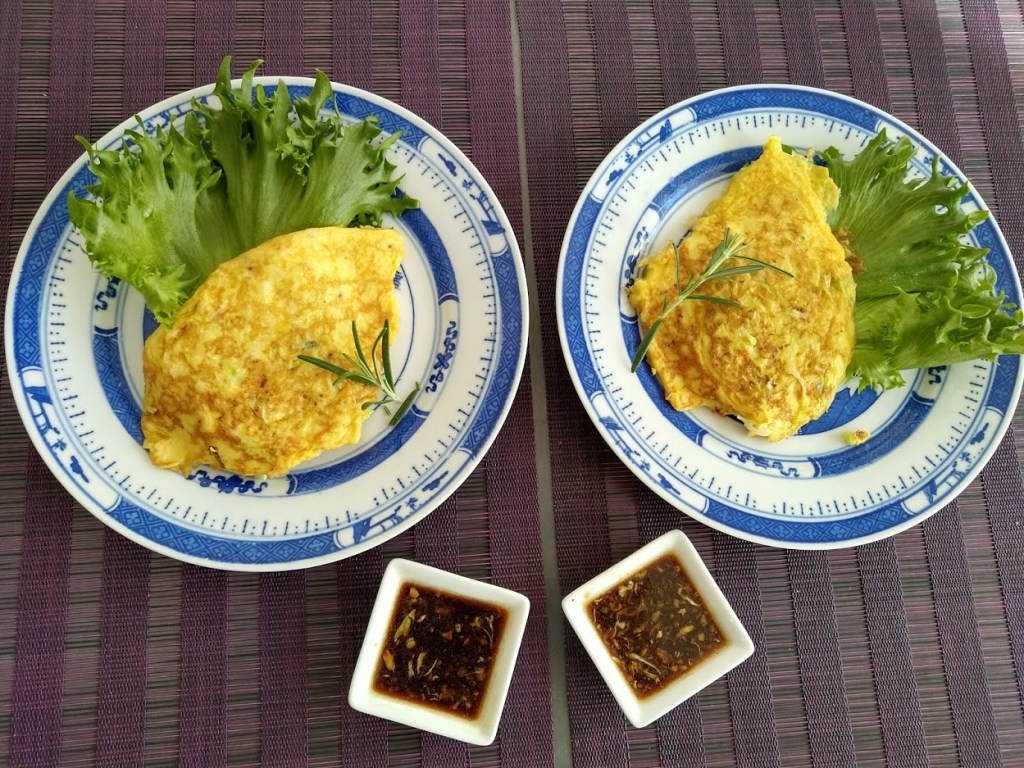 Pääsiäinen on kananmunien sesonkia. Muistin, että olemme matkoilla herkutelleet japanilaisella munakkaalla eli okonomiyakilla. Jääkaapissa sattui olemaan sopivasti puolikas varhaiskaali. Silppusin sen juustohöylällä ja lisäsin mausteeksi tuoretta rosmariinia. Kuullotin pannulla ja lisäsin joukkoon kaksi suolalla ja pippurilla maustettua ja kevyesti vatkattua kananmunaa. Paistoin muutaman minuutin molemmilta puolilta. Annoksesta tuli neljä kaunista lettua.