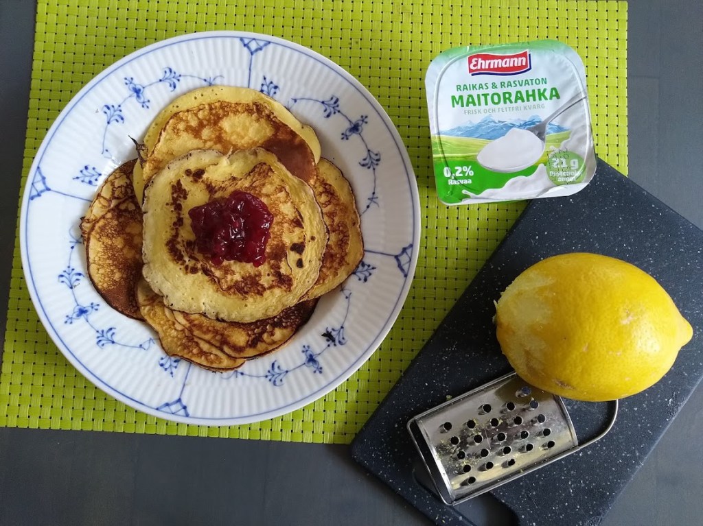 Tein pienelle perheellemme puoli annosta. Sekoitin ainekset ja annoin turvota puolisen tuntia. Paistoin miedolla lämmöllä voissa. Raastoin pinnalle luomusitruunan kuorta ja tarjosin puolukkahillon kera. Hyvin maistui.