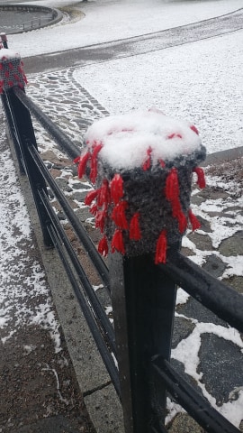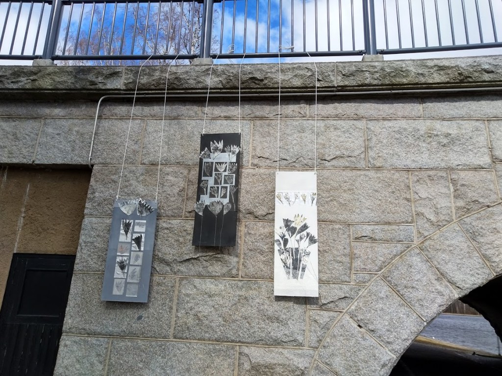 Oli vaikea katsoa, koska teokset olivat suorassa, kun tuuli riepotteli niitä. Minä tein solmuja sillankaiteeseen. Jussi ja Minttu huutelivat ohjeita. Nyt toivomme kaikki, että tulevat päivät ovat poutaisia.