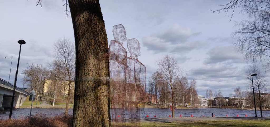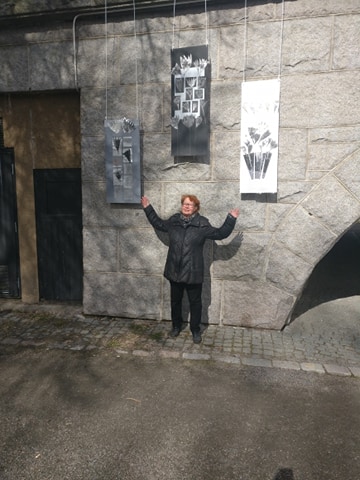 Puuskainen tuuli oli viedä mennessään, kun kannoin painavat mdf-levyt läheiseen ystävyydenpuistoon. Hämeenlinnan Taiteilijaseuran puheenjohtaja Minttu tuli avuksi ripustukseen.