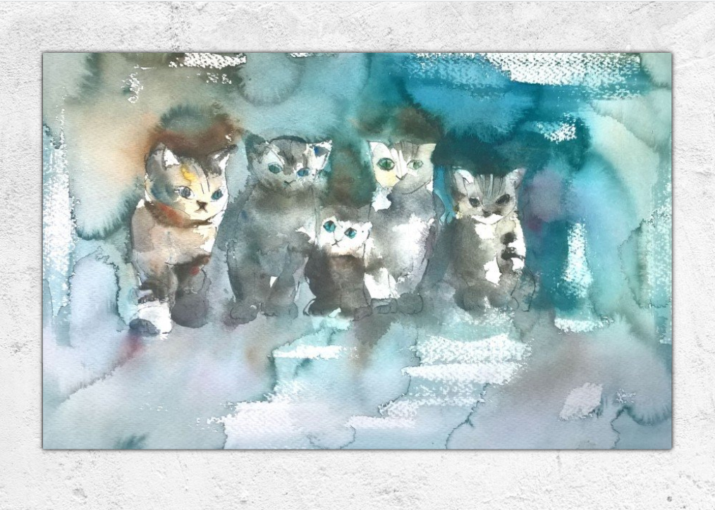 Taiko yllätti eilen. Sain sähköpostiin viestin, että kissa-akvarellini Uteliaat on myyty. Taiteilija kiittää ja rientää pakkaamaan isokokoisen maalauksen. Onneksi Taiko maksaa postimaksut.