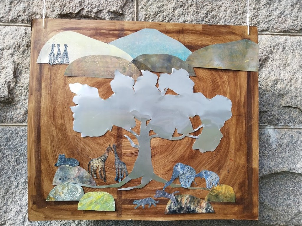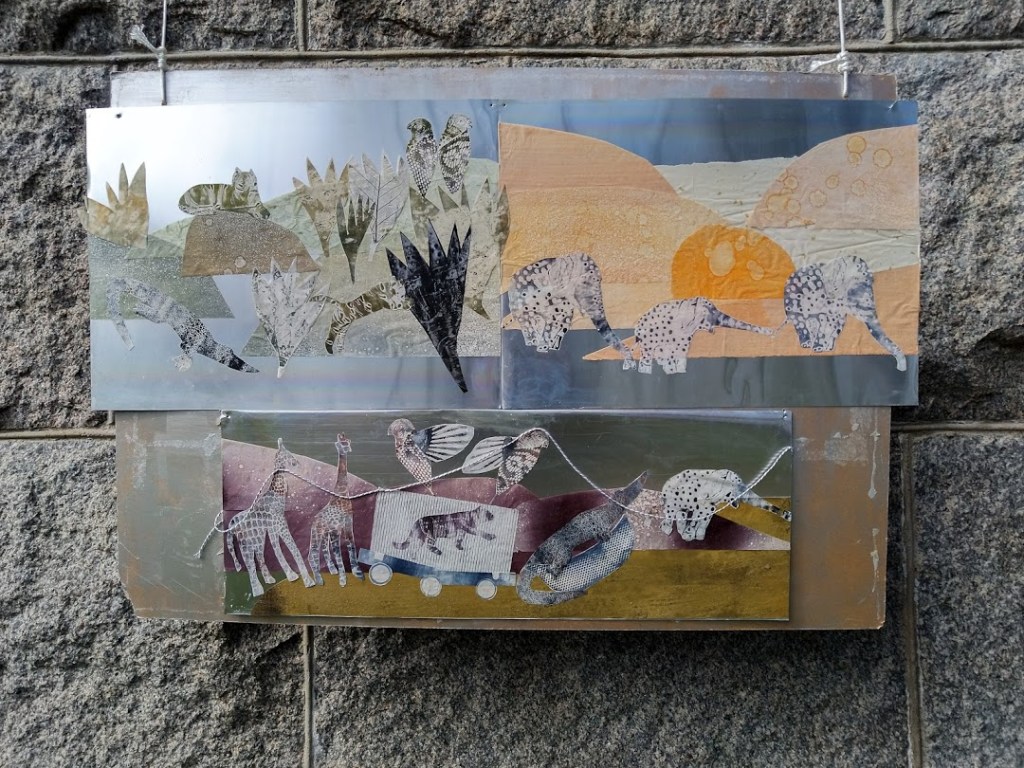 ”Tehtäisiinkö yhteiskollaasi puistoon?” graafikkoystäväni Tiina-Katriina kysyi. Minulle sopi. Tiina leikkasi offsetpellistä näyttävän puun. Minä sommittelin taustalle kuvataiteen aineopintojen lopputyönäyttelystä säästyneitä kukkuloita ja etualalle eläinhahmoja. Siis ei vedoksia vaan alkuperäisiä peltilaattoja.
