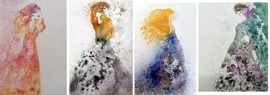 Olen taas innosta piukeana. Graafikkoystävä Tiina-Katriina opasti akvarellimonotypian teossa. Olihan sitä ihan pakko kokeilla. Meillä kun on tiedossa jatkossakin grafiikan ryhmänäyttelyjä. Yllätän itseni ja kollegat ripustamalla akvarellivedoksia.