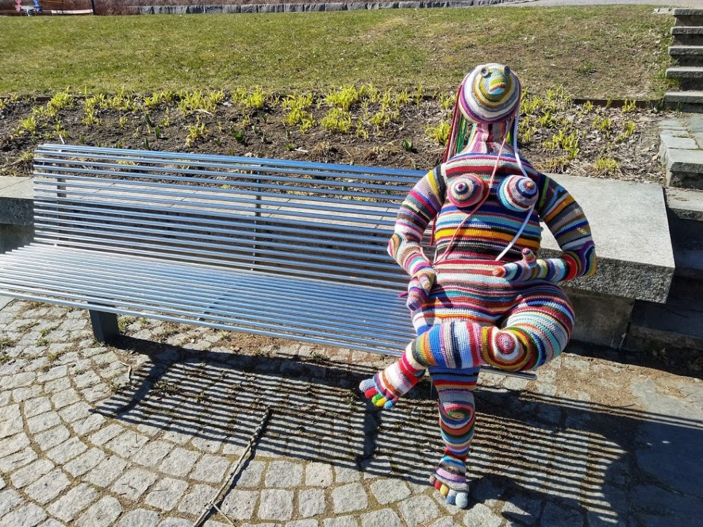 Pop up näyttelymme viereisessä Ystävyydenpuistossa jatkuu. Nyt sinne oli ilmestynyt hurmaava nukkenainen, joka on Elina Vänttisen käsialaa.