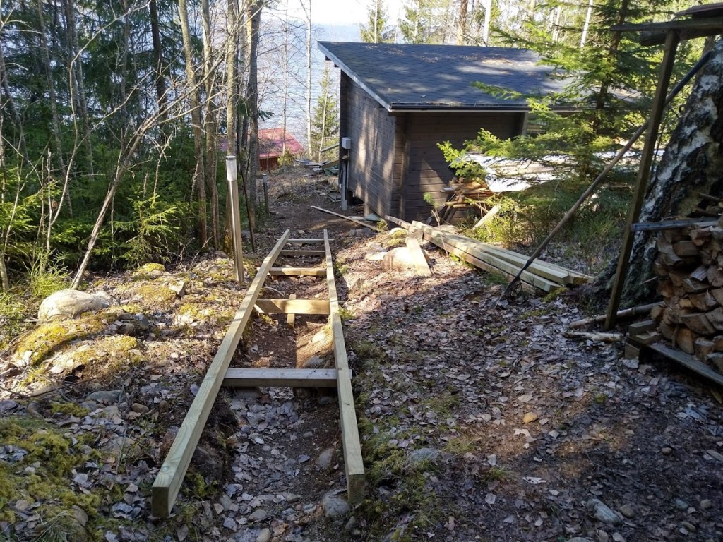 Vietimme tänään hyytävän kylmän päivän mökillä. Pääsin haravoimaan. Jussi halusi lähteä Terraan hakemaan lisää lautoja portaita varten. Niin sitten ajelimme iltapäivän aurinkoisina tunteina peräkärry perässä tarvikkeiden hankintamatkalla. Kun palasimme, aurinko oli pilvessä ja mökillä kylmä. Joimme sormet kohmeessa päiväkahvit, purimme kuorman ja palasimme kaupunkiin. Sauna on kohta kuuma ja lämmin illallinen tiedossa.