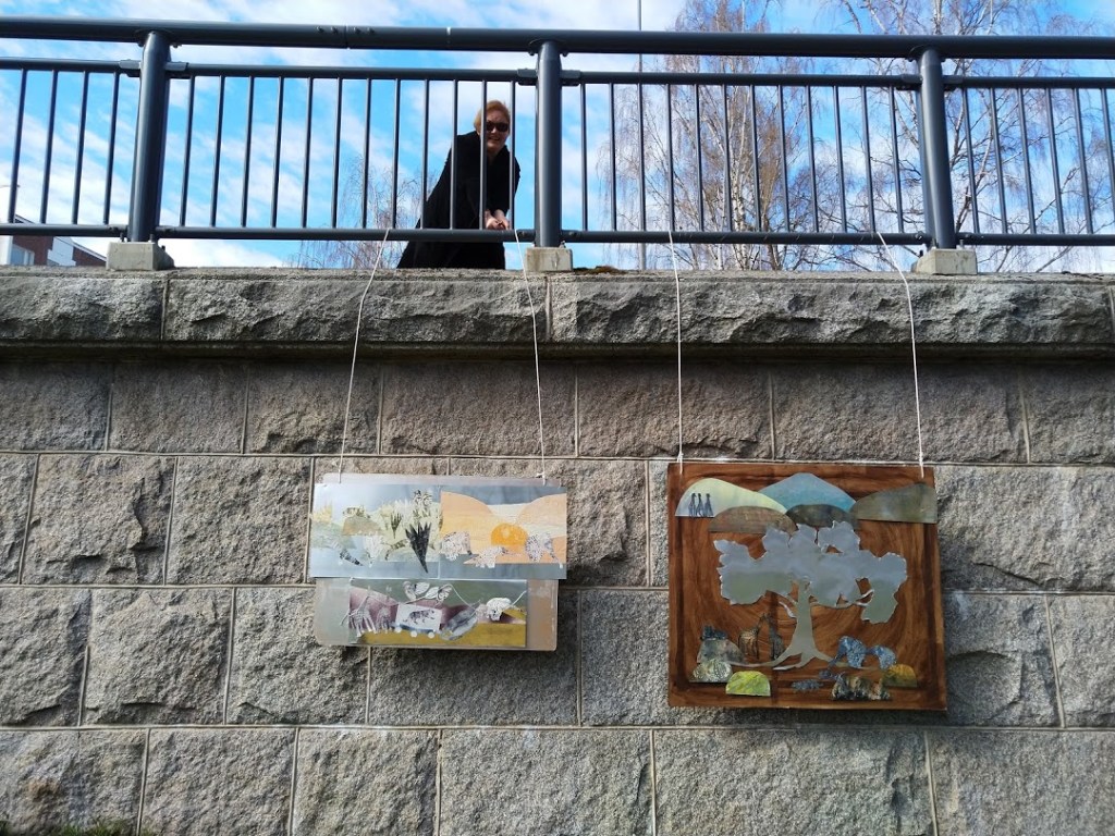 Aurinko paistoi heleästi, kun kiinnitimme työt riippumaan sillankaiteesta. Nyt jännitämme, pysyykö keli poutaisena. Jos ei, työt saavat sadetakit päälleen.