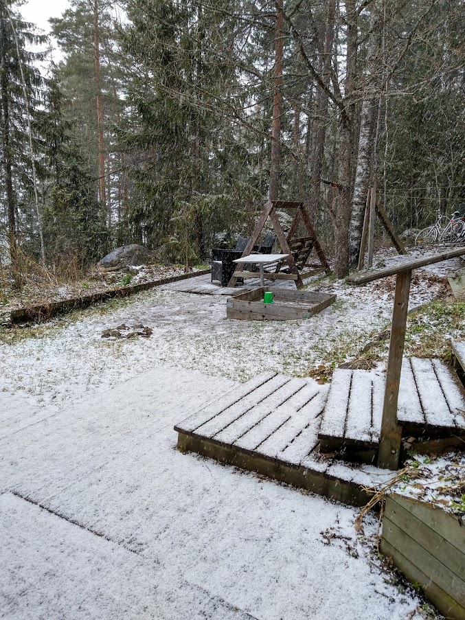 Tänään vappupäivänä kävimme mökillä. Olin haaveillut brunssista ulkona auringonpaisteessa. Aurinko ei näyttäytynyt, joten söimme sisällä. Oli kylmä.