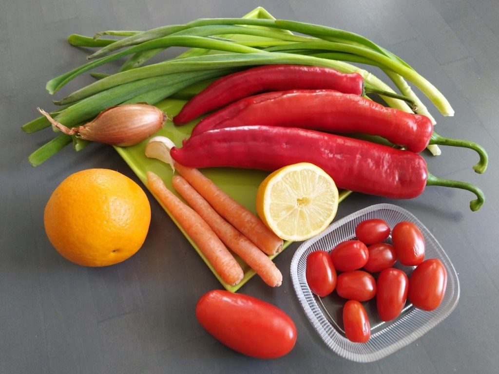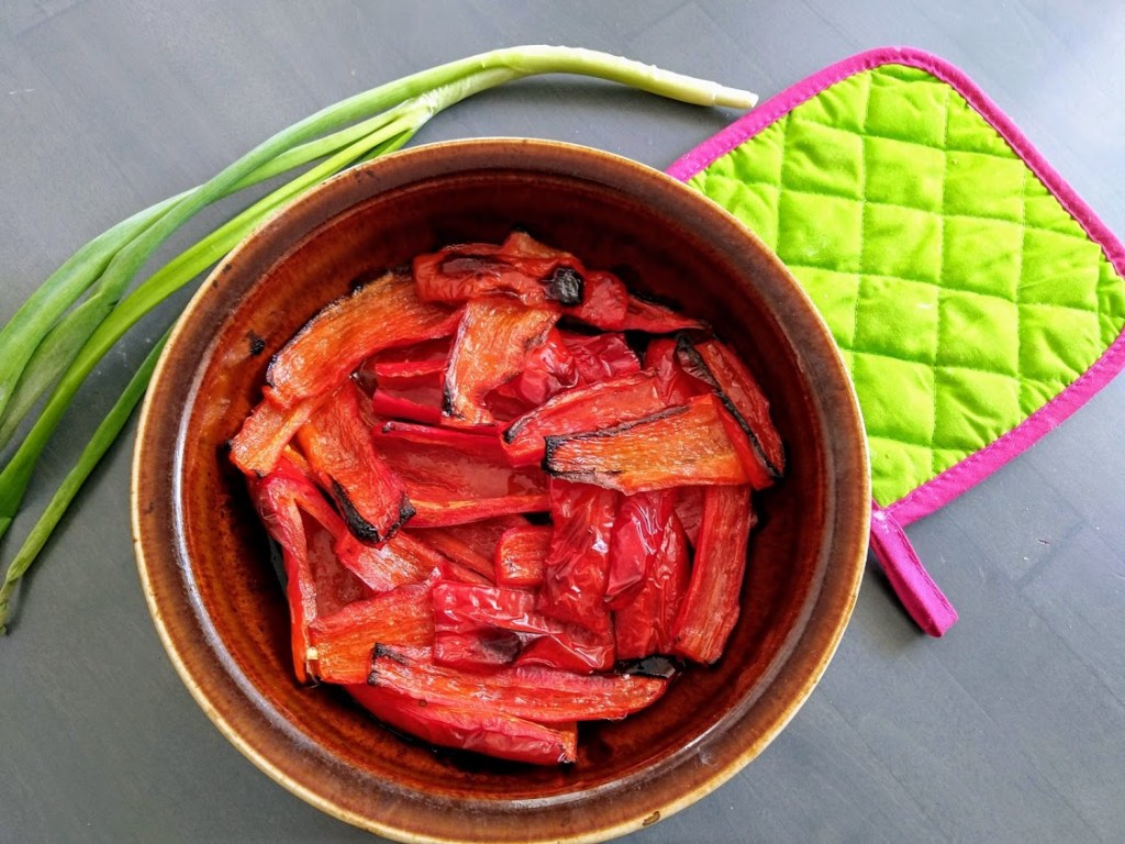 Pesin ja paloittelin vihannekset. Laitoin paprikat hetkeksi kuumaan uuniin. Tiesin kokemuksesta, että niistä tulee makeita.
