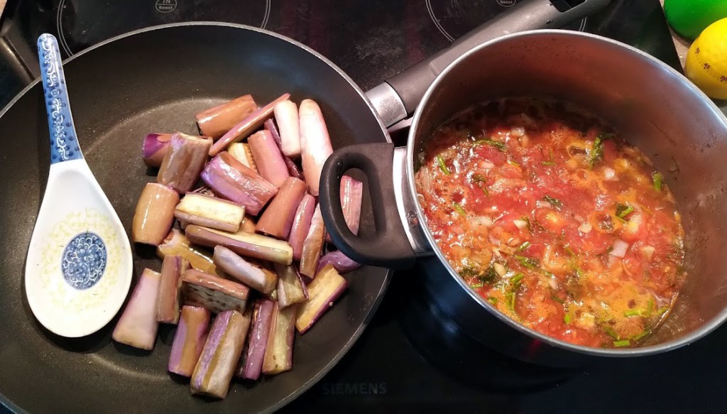 Eihän tällaisia voinut vastusta. Huuhtelin ja paloittelin ne. Kuullotin oliiviöljyssä. Kotimaiset tomaatit olivat edullisia. Olin niin reipas, että kalttasin ne. Paloittelin ja keittelin kastikkeen tomaateista ja salottisipulista. Lisäsin runsaasti hienonnettua valkosipulia, yrttisuolaa ja chilikastiketta.