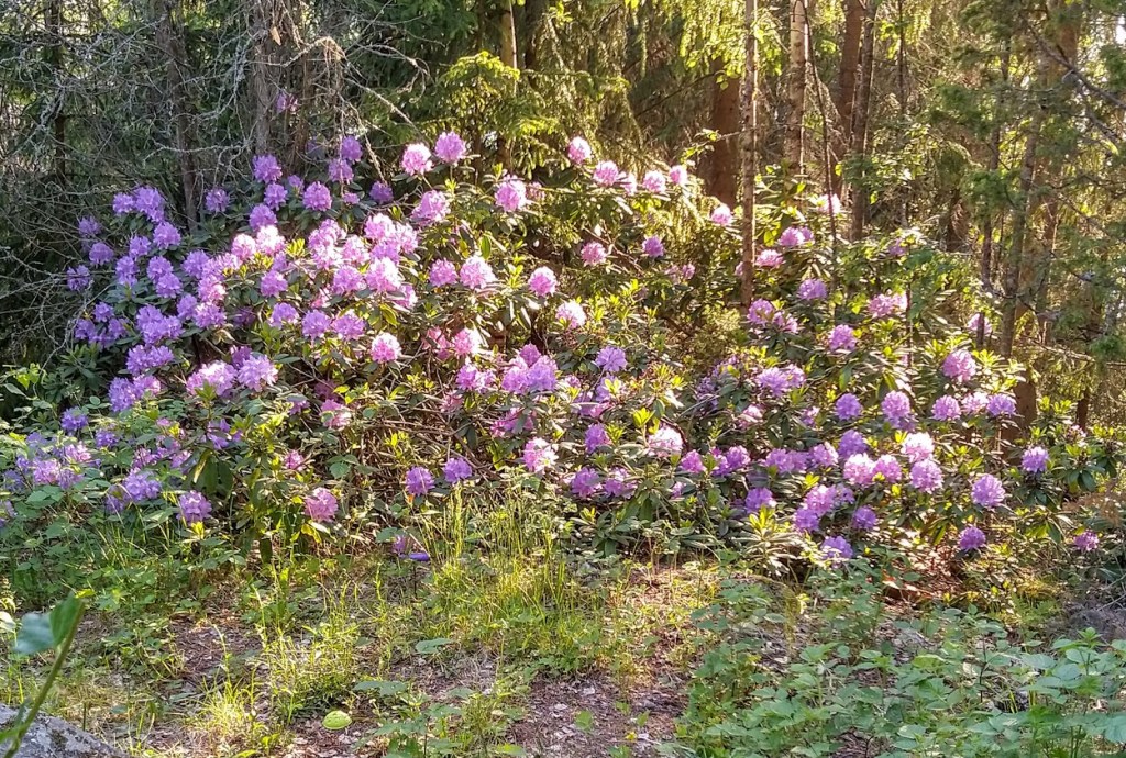 Palasimme ilta-auringon paisteessa mökille. Ikivanha alppiruusu oli avannut kaikki kukkansa yhtä aikaa.