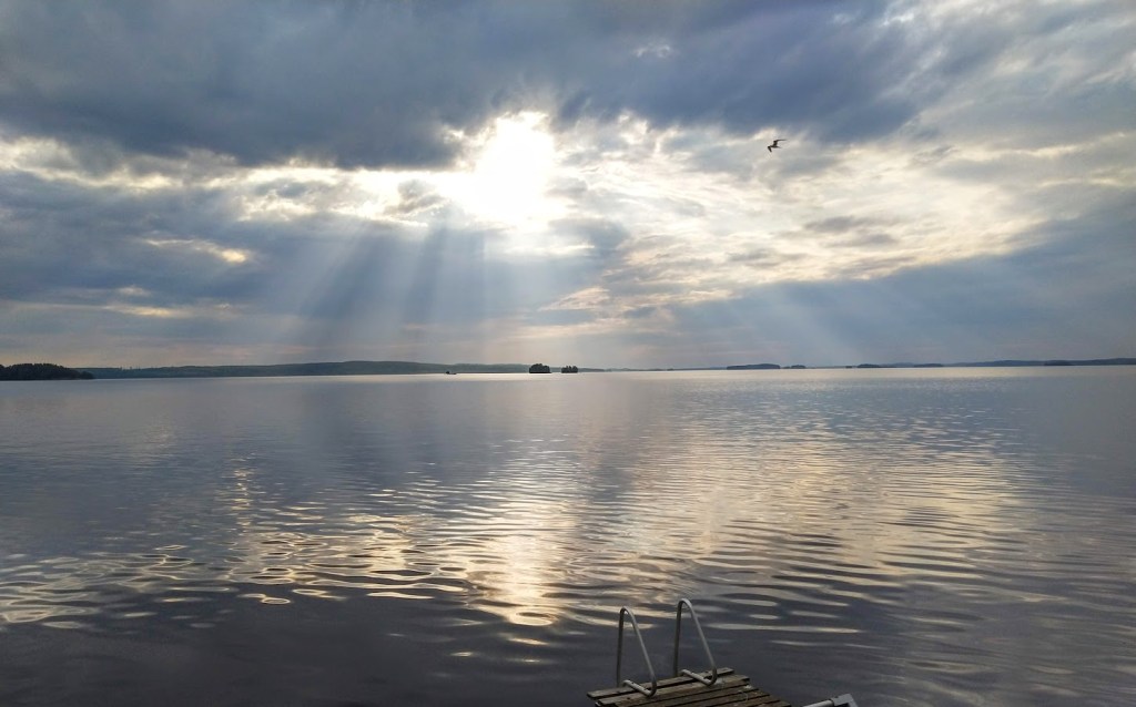 Saatiin eilen kaivattu kesäsade. Olin pakannut retkikorin ja ehdimme istuutua rantakeinulle, kun taivas tummeni. Hetken kuluttua rupesi putoilemaan raskaita pisaroita ja ukkonen jyrähteli. Siirsimme leirin saunamökin verannalle ja katselimme luonnon näytelmää.