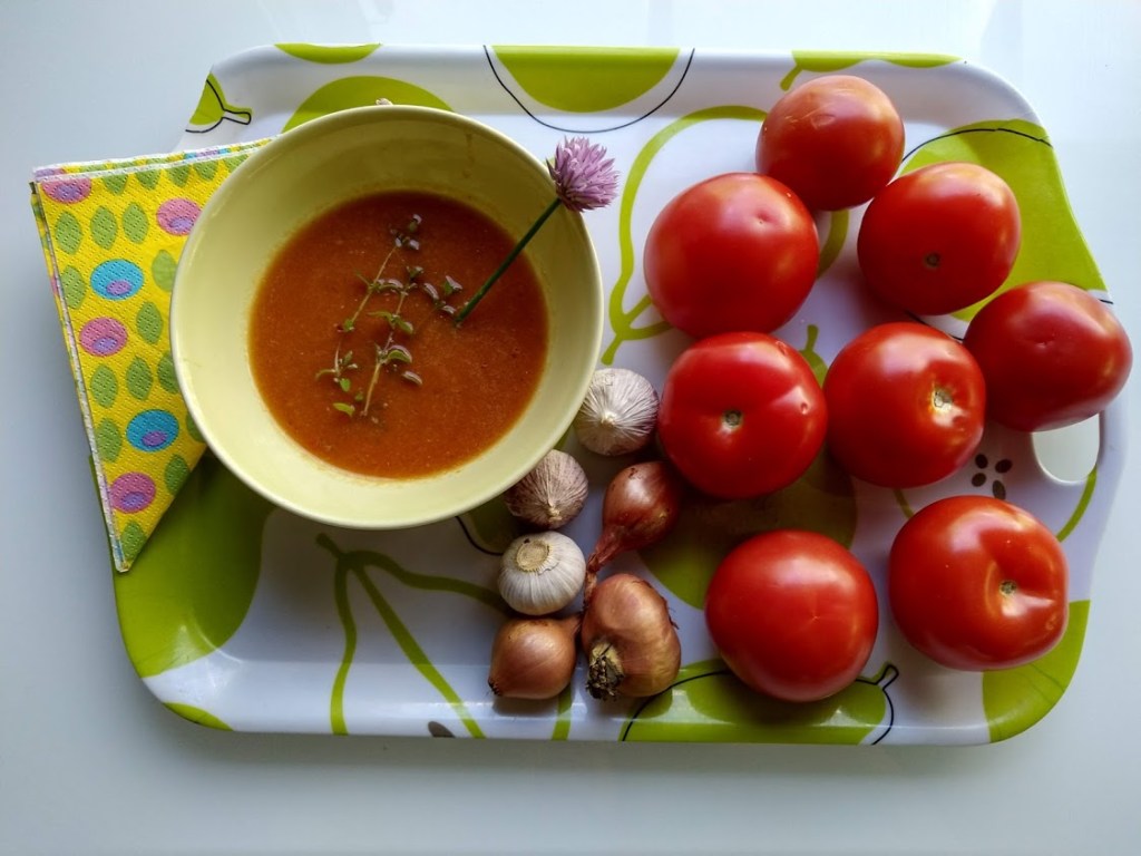 Kotimaiset tomaatit ovat taas mehukkaita, makeita ja edullisia. Olen oppinut jo taitavaksi kalttaajaksi. Kiehautan isossa kattilassa vettä, teen tomaatteihin ristiviillot ja kiehautan ne. Annan jäähtyä ennen kuin kuorin. Pilkon sillä välin salottisipuileita, valkosipuleita ja tuoretta inkivääriä. Kuullotan ne tilkassa hyvää oliiviöljyä timjaminoksien kera. Lisään vettä ja paloitellut tomaatit. Keitän kypsiksi ja soseutan sauvasekoittimella. Maustan yrttisuolalla, rouhitulla mustapippurilla, raastetulla luomusitruunankuorella, soijakastikkeella ja tilkalla sitruunanmehua.
