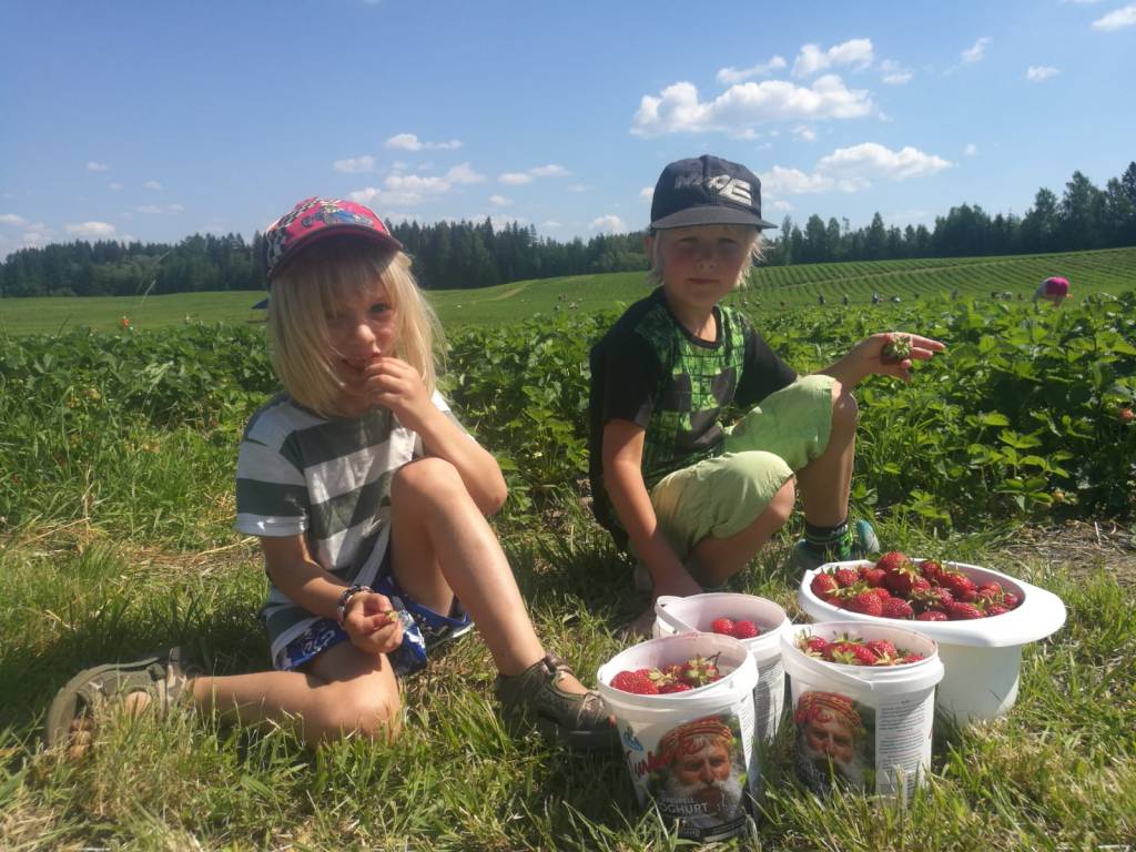 Anna ja pojat tulivat viettämään kesäpäiviä tänne mökille. He kävivät matkalla Tuusulassa poimimassa mansikoita 5:90 euroa kilo. Nyt on siis mansikkakausi avattu. Hyviltä maistuivat.