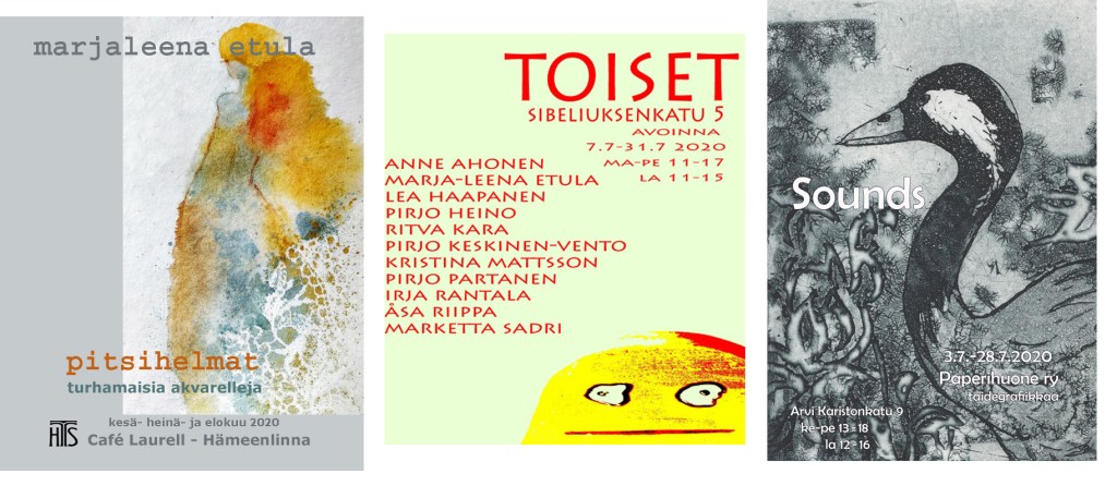 Olemme taas kaupungissa. Heinäkuun näyttelymme ripustus Galleria Paperihuoneella oli tänään ajankohtaista. Huomenna juhlimme avajaisia ja ensi viikon maanantaina seuraavia. Silloin on vuorossa Toiset-näyttely. Tervetuloa avajaisiin. Tässä tarkemmat tiedot: