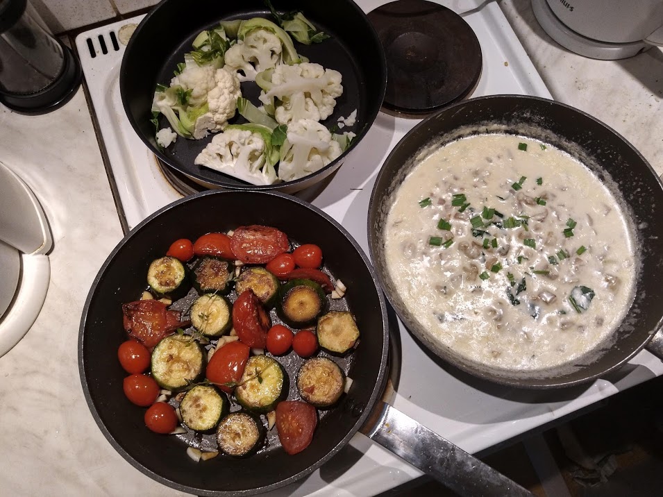 Valmistin muhevan sienikastikkeen sipulin ja kuohukerman kera. Lohkoin kesäkurpitsan viipaleiksi ja paistoin ne pannulla tomaattien ja valkosipulin kera.