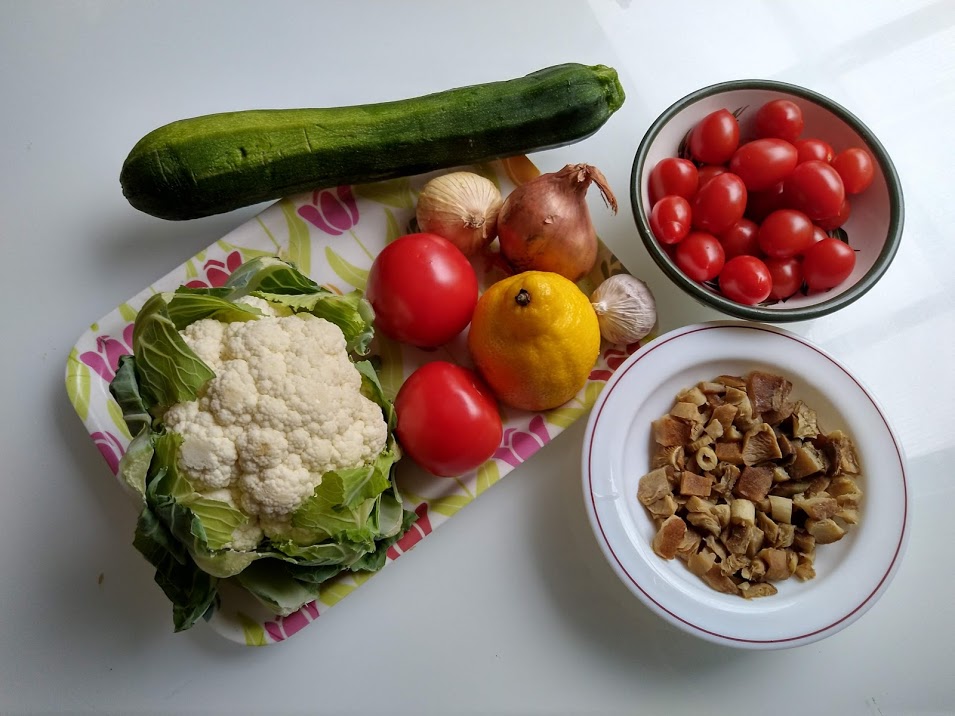 Suosin mökillä kala- ja kasvisruokia. Pienet tuoreet kukkakaalit ovat herkullisia. Pakastimesta löytyi viimeisiä viimevuotisia sieniä. Kiehautin kukkakaalin lohkoina.