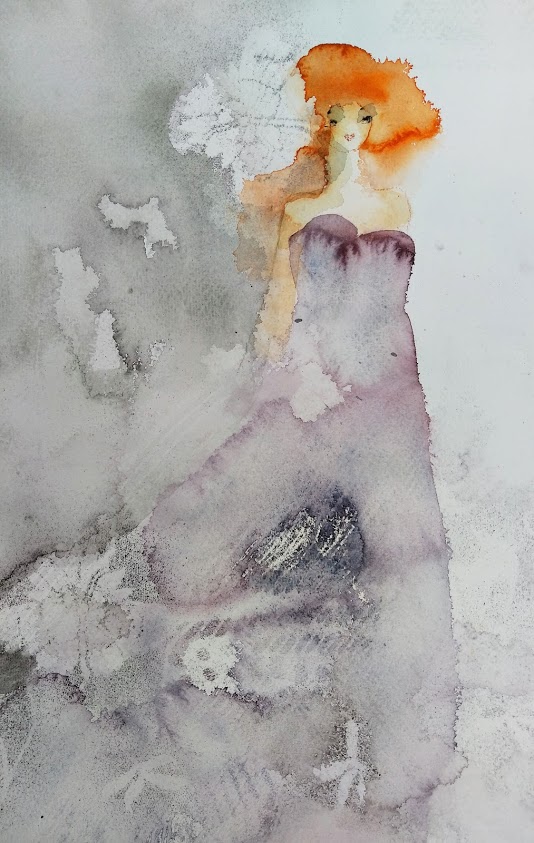 Kokeilin maalata yhden suurikokoisen akvarellin. Muotinäytökseen mahtui sopuisasti viisi mallityttöä.