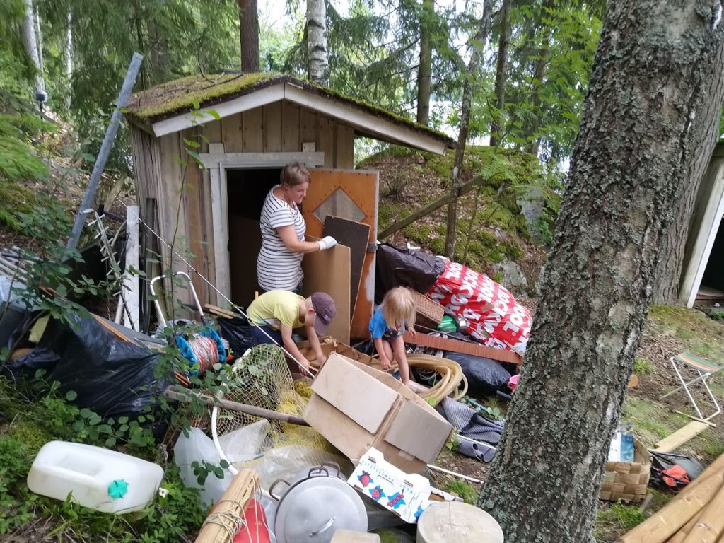 Miska ja Visa halusivat leikkimökin käyttöön. Anna laittoi työhansikkaat käteen ja ryhtyi tyhjentämään sitä. Mökistä löytyi kalastusvälineitä, pari käytöstä poistettua pumppua, työkaluja sekä korillinen aarteita. Me konsultit eli Jussi ja minä kommentoimme, mitä säästetään, mitä pannaan kaatopaikkakuormaan. Kävin illalla läpi pinon joulukortteja 1970-80 luvuilta. Muutama kirje on vielä tutkimatta. Hauskin löytö oli minun ja siskon piirustukset.