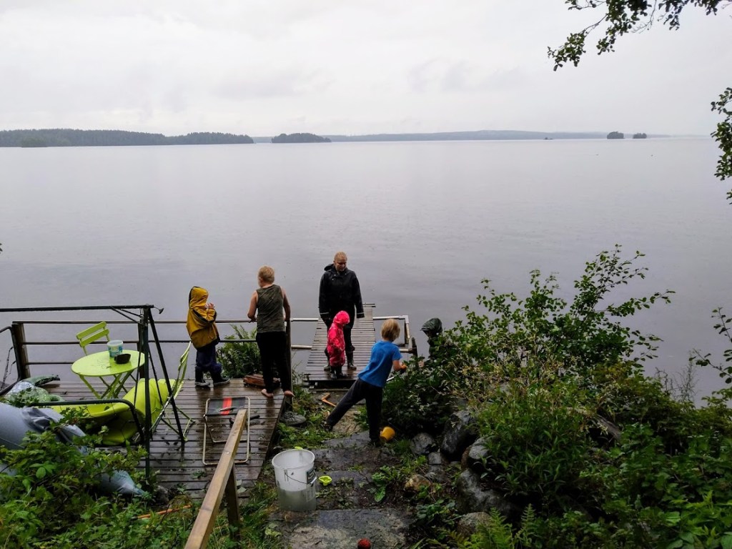 Meillä oli tänään leirinpurku. Miika viimeisteli verannan lattiaa. Hän ei tainnut arvata, että yksi lomaviikko vierähtää työnteossa.