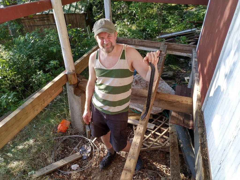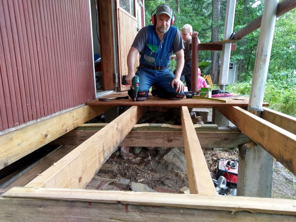 Olemme saaneet sadetta ja auringonpaistetta. Saunamökin veranta on uhannut lahota. Miika purki lattian ja askaroi painekyllästetystä puusta uuden.