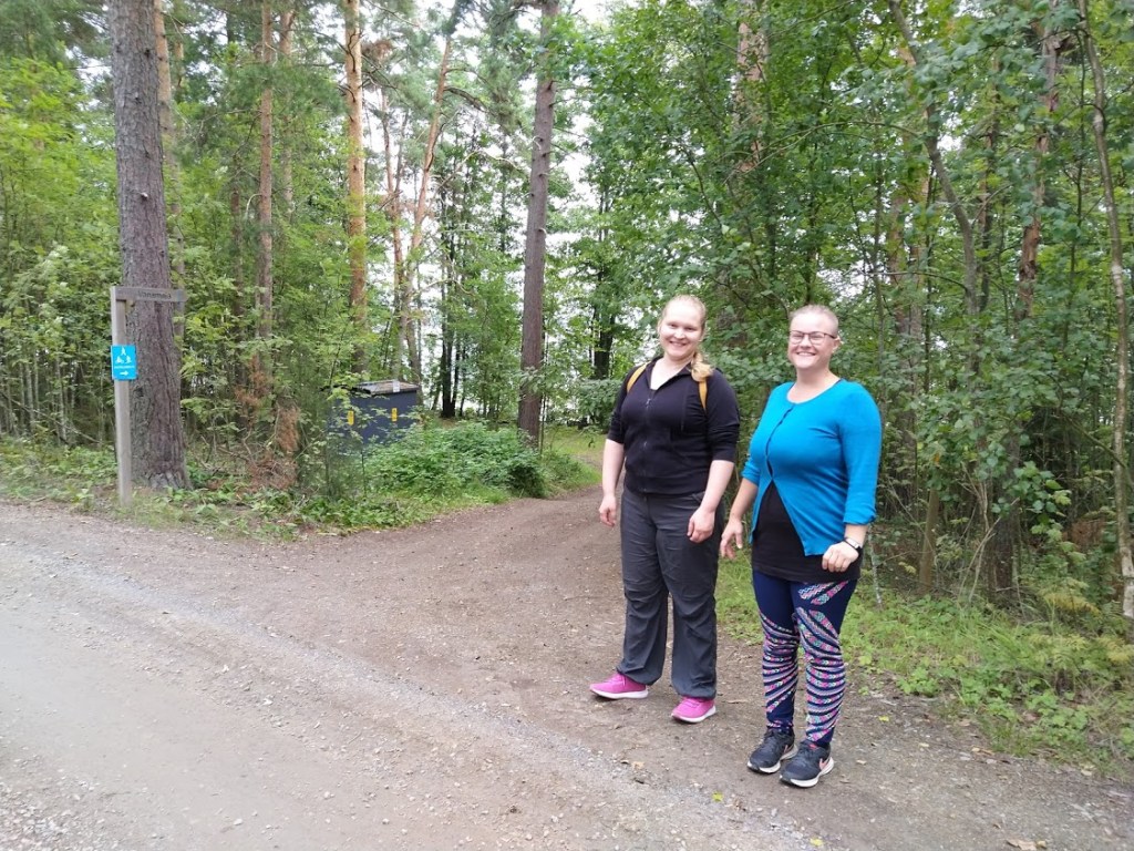 Anna ja Laura kunnostautuivat kiertämällä reippaasti suolenkin. Heillä oli tuliaisina komeat sienipussit.
