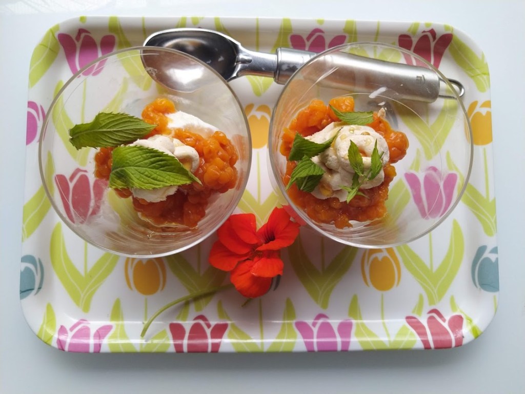 Pavlovan innoittamana kokeilin valmistaa jäätelö-lakka-marenkiherkun. Ladoin lasimaljoihin vuorotellen vaniljajäätelöpallon, tuoreita lakkoja ja marenkia. Valutin pinnalle juoksevaa hunajaa ja poimin kasvimaalta mintunlehtiä koristeeksi. Makuyhdistelmä toimi. Suosittelen.
