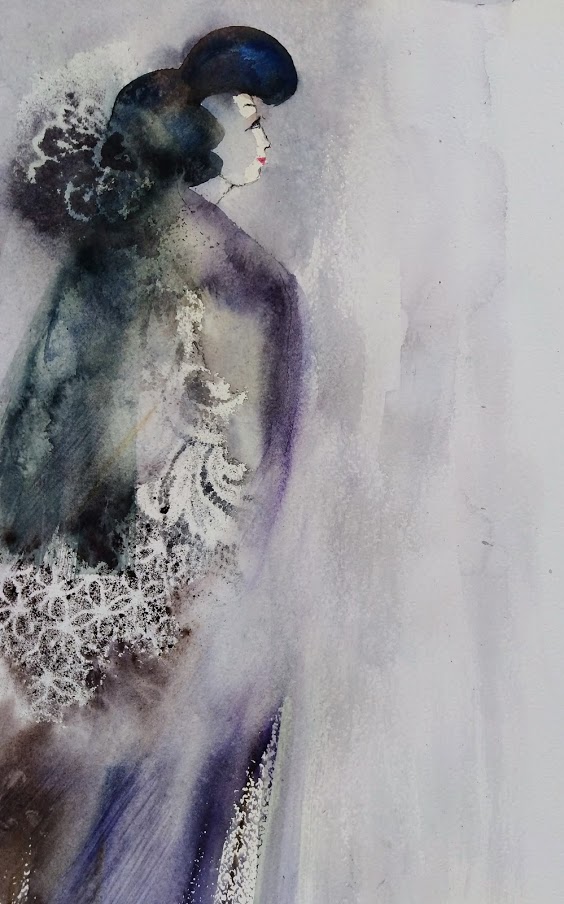Olen maalannut japaniaiheita ennenkin. Idän eksotiikka kiehtoo. Kokoa näillä neitosilla on 50 x 40 cm.