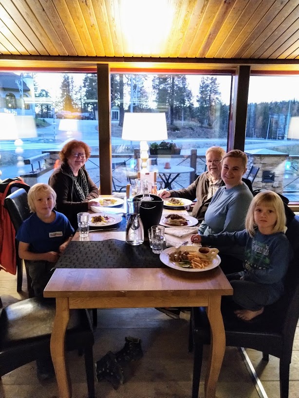 Illalla kävimme ulkona syömässä. Tunturihotellin Kaltio-ravintola tarjosi poronkäristystä ja nieriää. Kyllä maistui. Huomenna on tällä erää viimeinen retkipäivä. Paluumatka kohti etelää alkaa illalla.