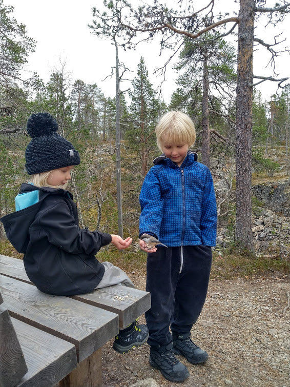 Päivän kohokohta oli kun pojat pääsivät syöttämään lapintiaisia. Linnut olivat uskomattoman kesyjä.