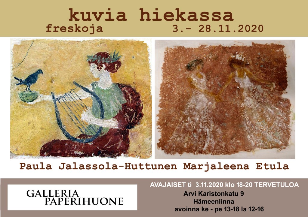 Tänään on taas kerran jännittävä päivä, kun saan viimeisimmät freskot irrotettua liimauksista. Yhden tekeminen kestää oikeasti neljä viikkoa. Ensin tehdään kehikkoon rappaus, jonka märkään pintaan kuva maalataan pigmenteillä ja vedellä. Viikon kuivumisen jälkeen kuva siirretään luuliimalla (haisee kaamealle) sideharsolle. Taas kuivatetaan viikko ja koputellaan fresko irti kehikosta. Kuvan päälle sivellään nyt D-akryyliliimaa ja siirretään se ohuelle kankaalle. Kuva siis palautuu peilikuvasta oikein päin. Seuraavalla kerralla sideharso ja ylimääräinen liima poistetaan liottamalla kankaita kuumassa vedessä. Nyt maalaus on siis ohuella kankaalla valmiina kiinnitettäväksi kiilakehyspohjalle. Työlästä, jännittävää, kiehtovaa.