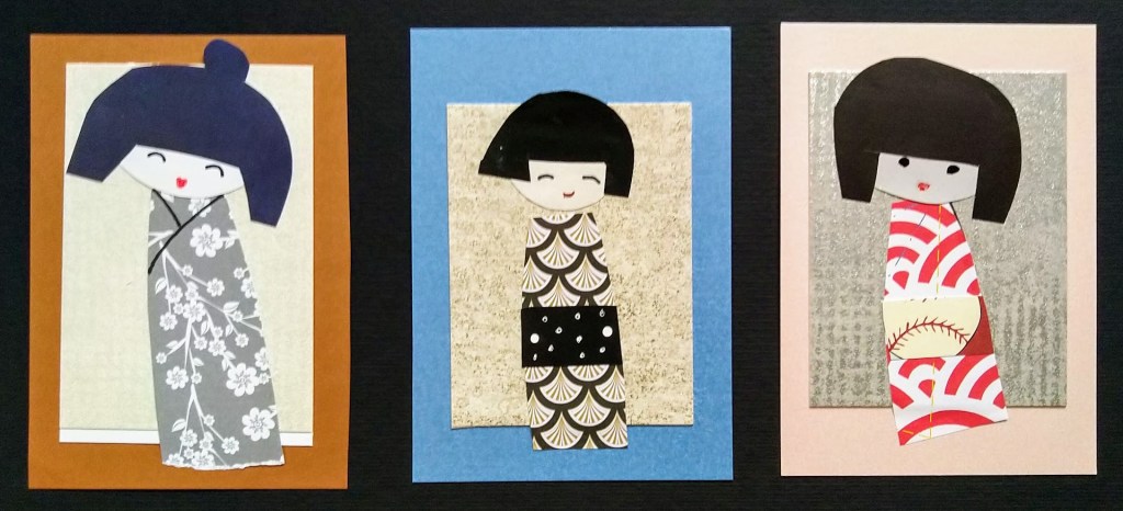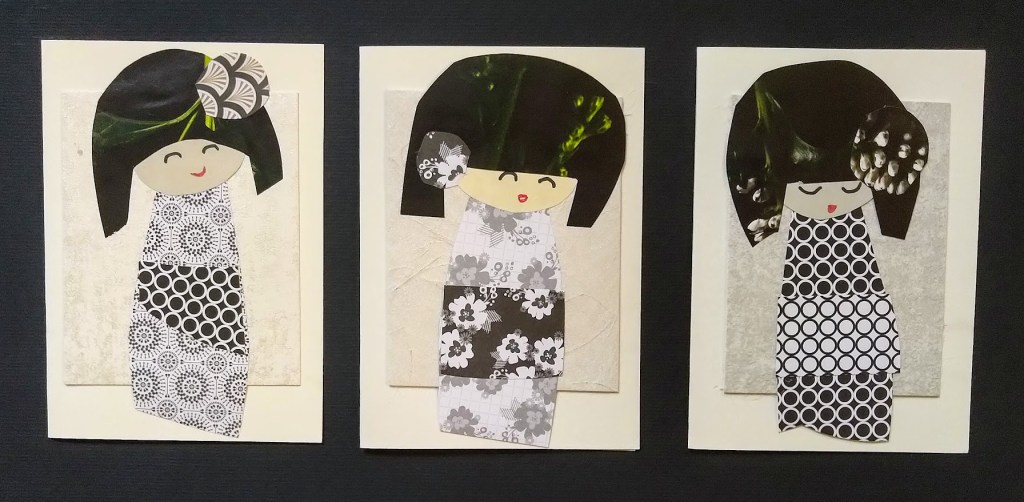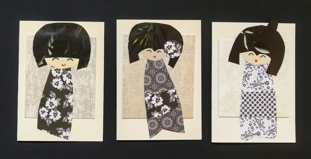 Värikkäät kortit ovat yksipuolisia. Innostuin askartelemaan muutaman lähes mustavalkoisen tyttösen luonnonvaaleille kaksipuolisille korttipohjille.