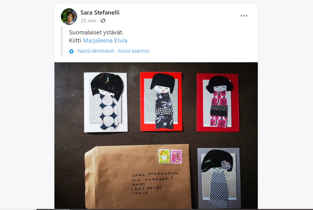 Selasin joka-aamuiseen tapaan facebookia. Oli ilo saada tervehdys kaukaa Roomasta. Sara on tuttu parin vuoden takaiselta Nazzanon taidematkalta. Kimononeitoseni pääsivät valloittamaan maailmaa:)