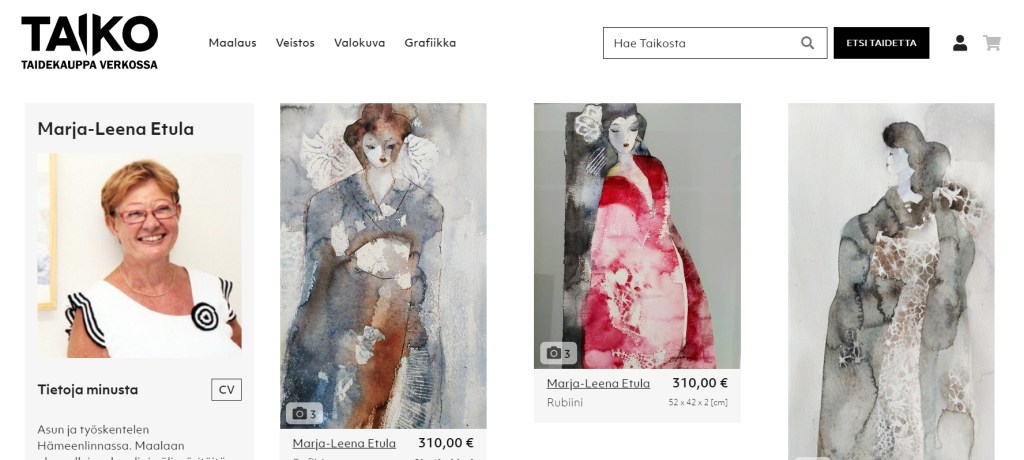 Taiko – taidekauppa verkossa https://www.taiko.art/marja-leenaetula hehkuttaa 10% alennusta koodilla BLACK10. Päivitin sivuilleni uusia akvarelleja. Ne ovat nähtävissä livenä vielä tänään ja huomenna Galleria Paperihuoneella.