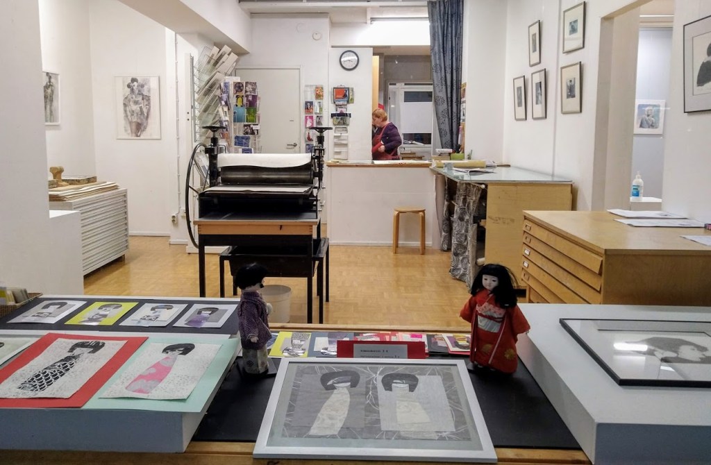 Se oli mukava yllätys. Suunnittelen jo, että ripustan ensi vuoden puolella kimonoaiheisen näyttelyn grafiikanpajallemme.