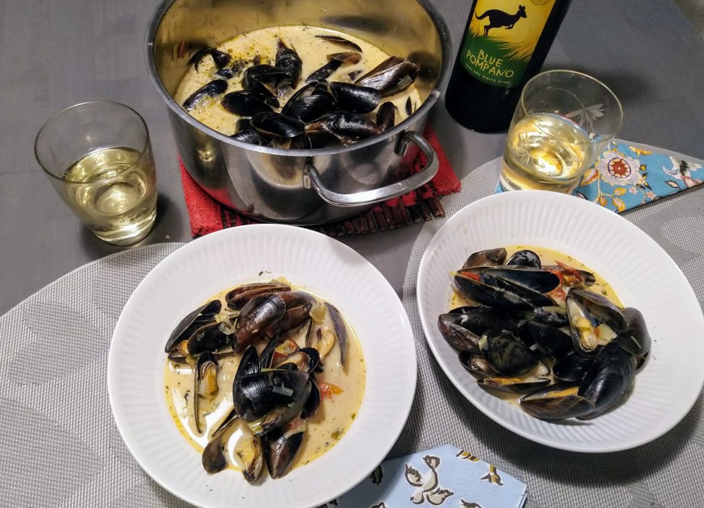 Lisäsin keitokseen puhdistetut sinisimpukat. Keittelin muutaman minuutin ja nostin sitten kattilan pöytään. Tarjosin tuoksuvan herkun kanssa paahtoleipää ja kylmää valkoviiniä. Ilta kirkastui hetkessä.