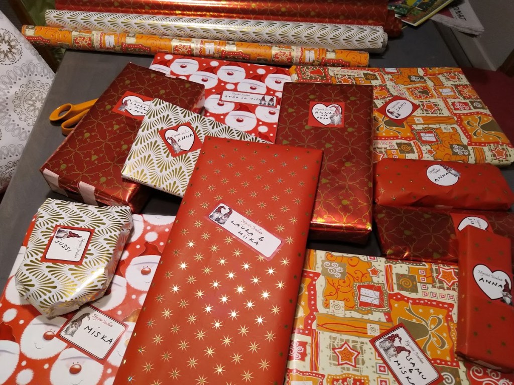 Askartelin eilen tärkeimmissäkin hommissa. Leenan lahjapakkaamo oli vauhdissa. Olemme jo vuosia sitten sopineet, että annamme lahjoja vain lapsille. Jotenkin päätös on lipsunut ja pakettia kertyi enemmänkin. Tänä vuonna joulupukki jättää lahjat oven taakse koronavaaran vuoksi. Se päivä on jo huomenna.