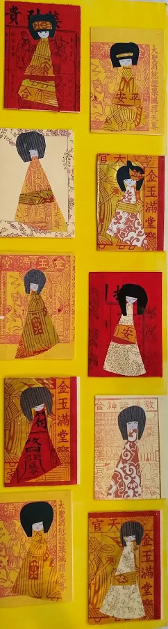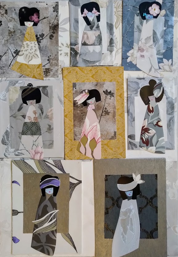 Sain Annalta joululahjaksi hurmaavia kiinapapereita. Askartelin niistä kollaasikortteja ja kiinnitin kauneimmat keltaiselle kapalevylle. Tekeillä on kaiken tämän lisäksi kolme temperamaalausta. Ne ovat viimeistelyä vailla.