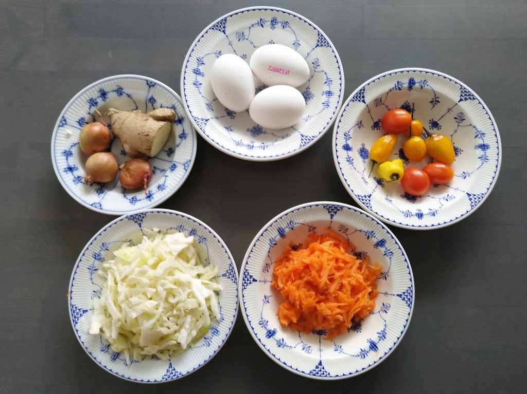 Sekoitin kolmen munan lettutaikinan turpoamaan. Kuullotin kaali- porkkana- salottisipuli- inkivääriraasteen ja lisäsin pikkutomaatteja ja yhden chilin väriä ja makua tuomaan. Maustoin soijakastikkeella ja limenmehulla.