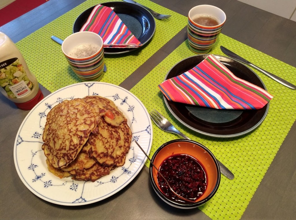 Paistoin letut pikkupannulla ja tarjosin kuumina puolukkahillon ja kirpeän caesarkastikkeen kera.