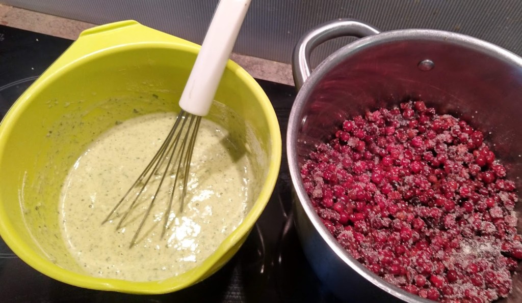 Seuraava kokeilu oli sekoittaa valmiiseen pinaattikeittoon pari kananmunaa ja ripaus vehnäjauhoja. Kiehautin samalla uuden erän puolukoita sokerin kera hilloksi.