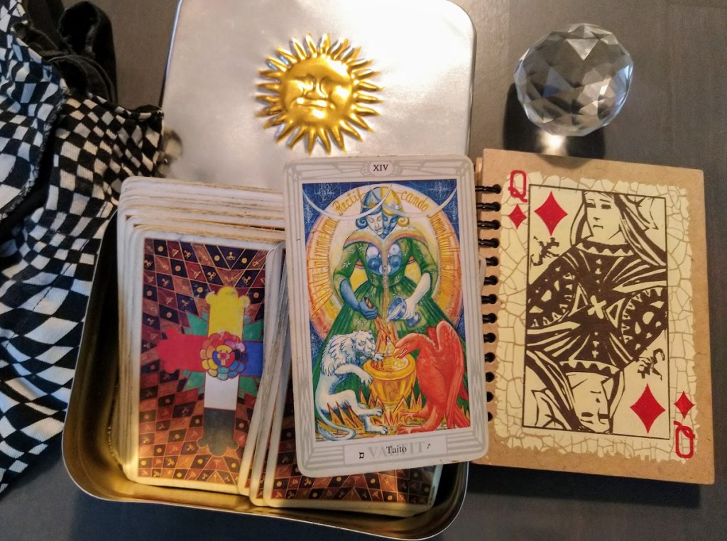 Vetäydyin illalla työhuoneeseen ja otin pitkästä aikaa tarotkortit esille. Sekoitin pakan ja nostin varovasti onnenkortin. Yksi erottui muista. Käänsin sen ja ilahduin. Korttiin oli kuvattu vihreäpukuinen nainen, joka symboloi luovuutta. Taito, lohtua elämään. Kortti merkitsee haastetta katsoa sisäänpäin, tulkitsin. Vaikka elämä ahdistaa, minulla on henkiset voimavarat piirtää, maalata, lukea, kirjoittaa, opiskella. Tarotkortit auttoivat selkiyttämään ajatuksia. Kyseinen kortti kertoi, että elämässä on monta puolta eikä kannata juuttua vastoinkäymisiin.