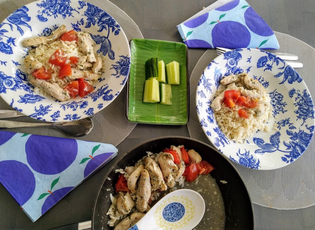 Seuraavaksi silmiin sattui broilerisuikaleita, jotka oli maustettu sitruunaruoholla ja basilikalla. Paistoin ne pannulla tomaatinlohkojen kera. Keittelin riisiä kaveriksi. Mausteet olivat kohdallaan. En lisännyt muuta kuin riisin keitinveteen vähän suolaa. Suosittelen.