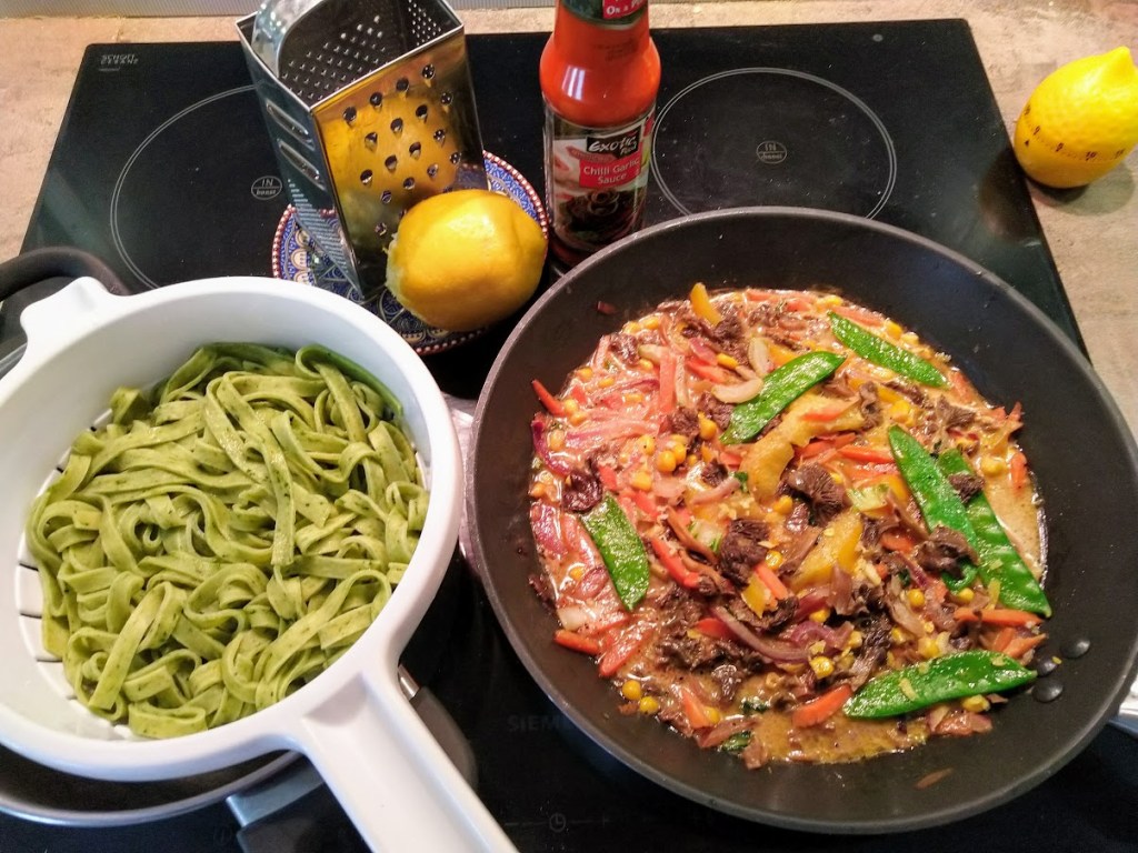 Kaupoista löytyy nykyään kiinnostavia tuoreita valmispakkauksia. Keittojuureksia, Aasiawok, Thaiwok. Ostin thaiwokkiainekset ja kuullotin ne pannulla. Lisäsin pakasteesta pussillisen suppilovahveroita ja tilkan kookoskermaa. Maustoin yrttisuolalla, soijakastikkeella, raastetulla luomusitruunalla ja tulisella chili-valkosipulikastikkeella. Maku oli erinomainen. Tarjosin vihreän tuorepastan kera. Suosittelen.