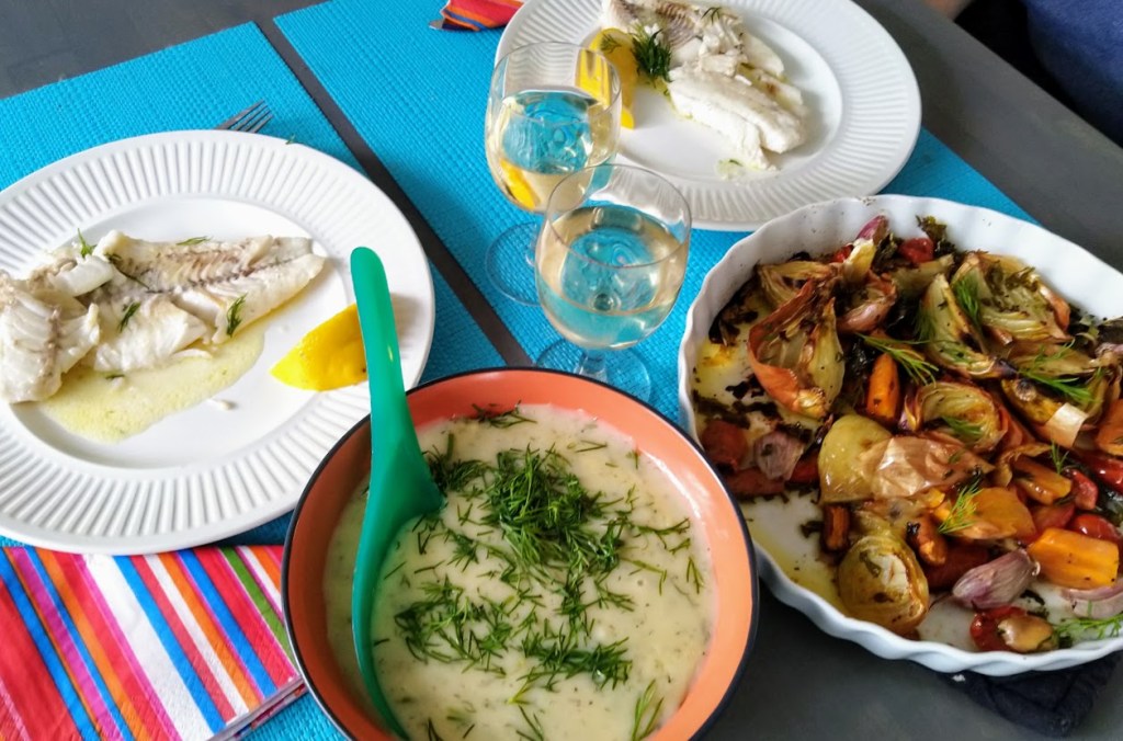 Katselin televisiosta Jamie Oliveria, joka paahtoi sipuleita kuorineen uunissa. Laitoin vuokaan myös porkkananpätkiä ja kirsikkatomaatteja. Kasviksista tuli ihanan makeita. Paistoin kalat voi-öljyseoksessa pannulla. Tarjosin kuoriperunoiden ja herkkukastikkeen kera. Valkoviiniä jäi vielä tilkka laseihin.