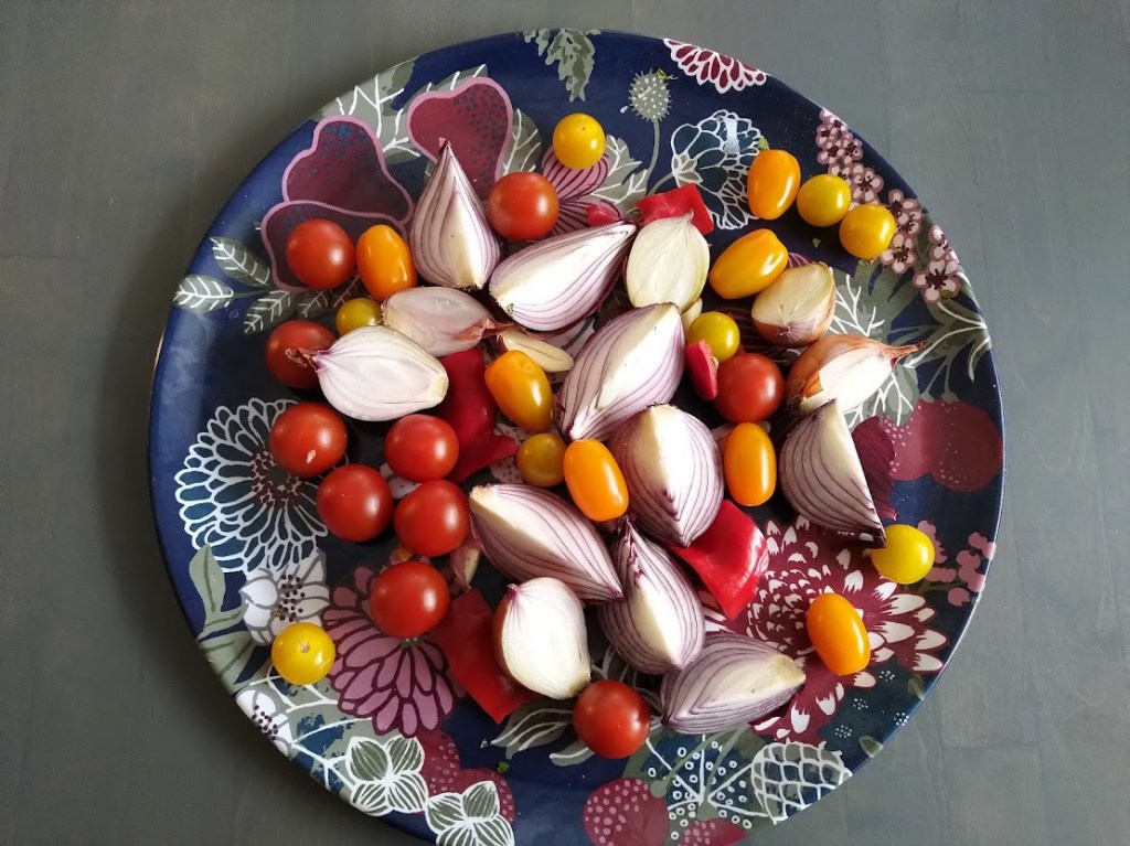 Paahdetut sipulit syntyivät Jamie Oliverin kokkausohjelman innoittamina. Lohkoin sipulit kuorineen uunivuokaan. Laitoin mukaan makeita tomaatteja. Valelin päälle oliiviöljyä ja maustoin suolalla ja sitruunapippurilla.
